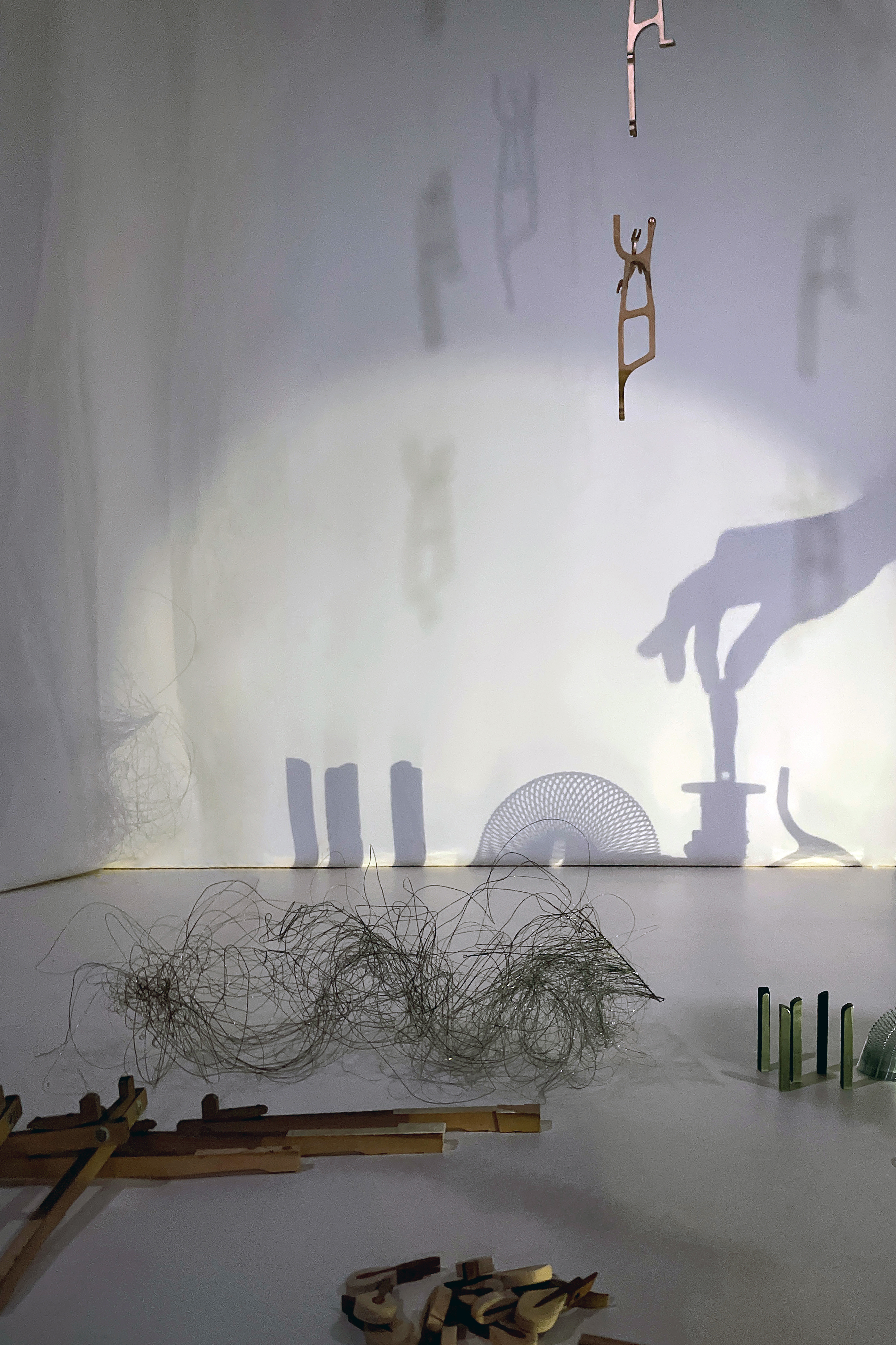 A partir de pièces détachées de pianos, un vocabulaire s’établit, des assemblages prennent forme et leur projection par jeux d’ombres révèle une dimension supplémentaire.
